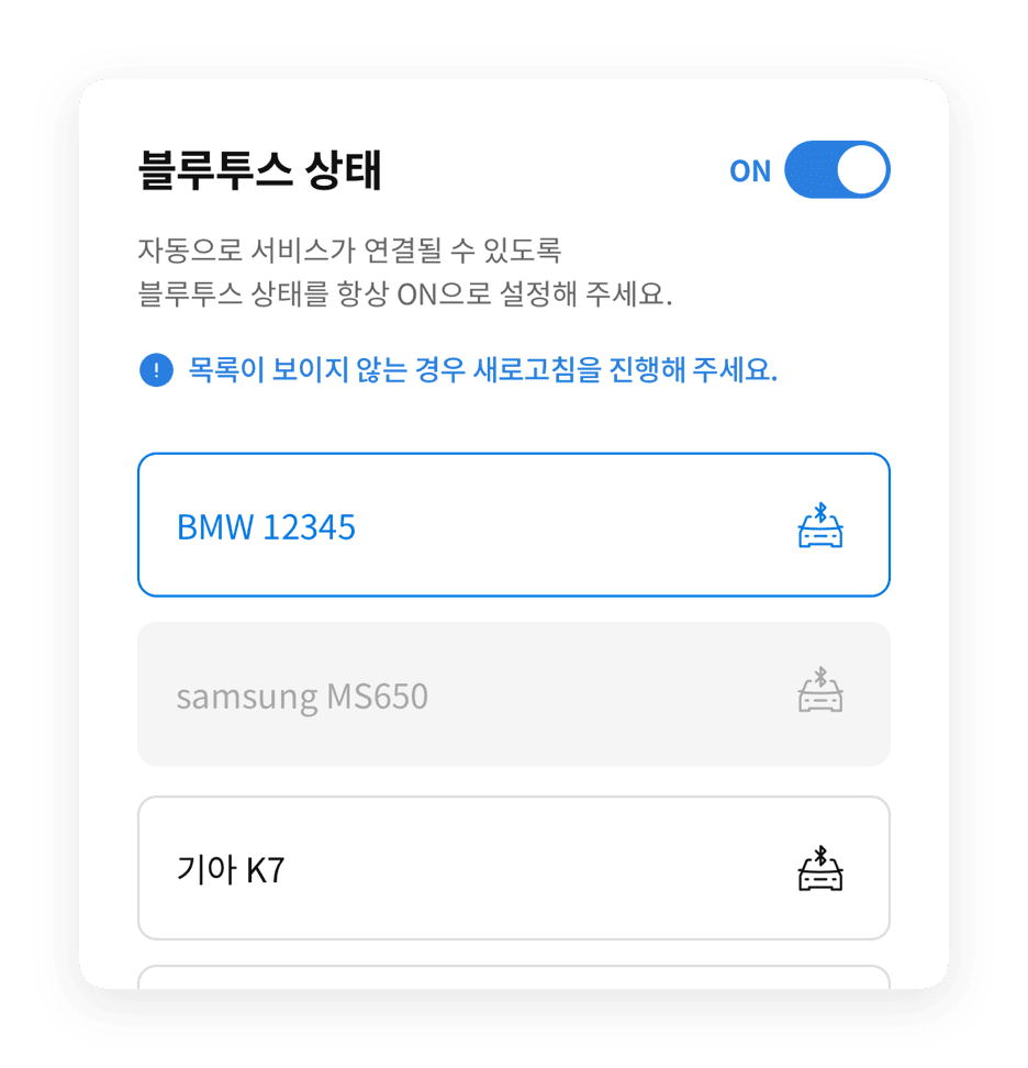 • 본 서비스는 주행정보에 따라 포인트를 지급하는 서비스로 차량 블루투스 외 다른 기기 블루투스에 연결 시 이용이 제한될 수 있습니다.